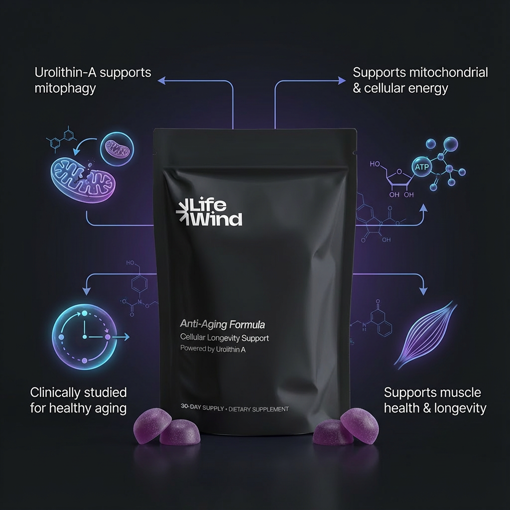Powered by Urolithin A, LifeWind's signature formula is your secret weapon for vibrant longevity. Feel the difference from the inside out.